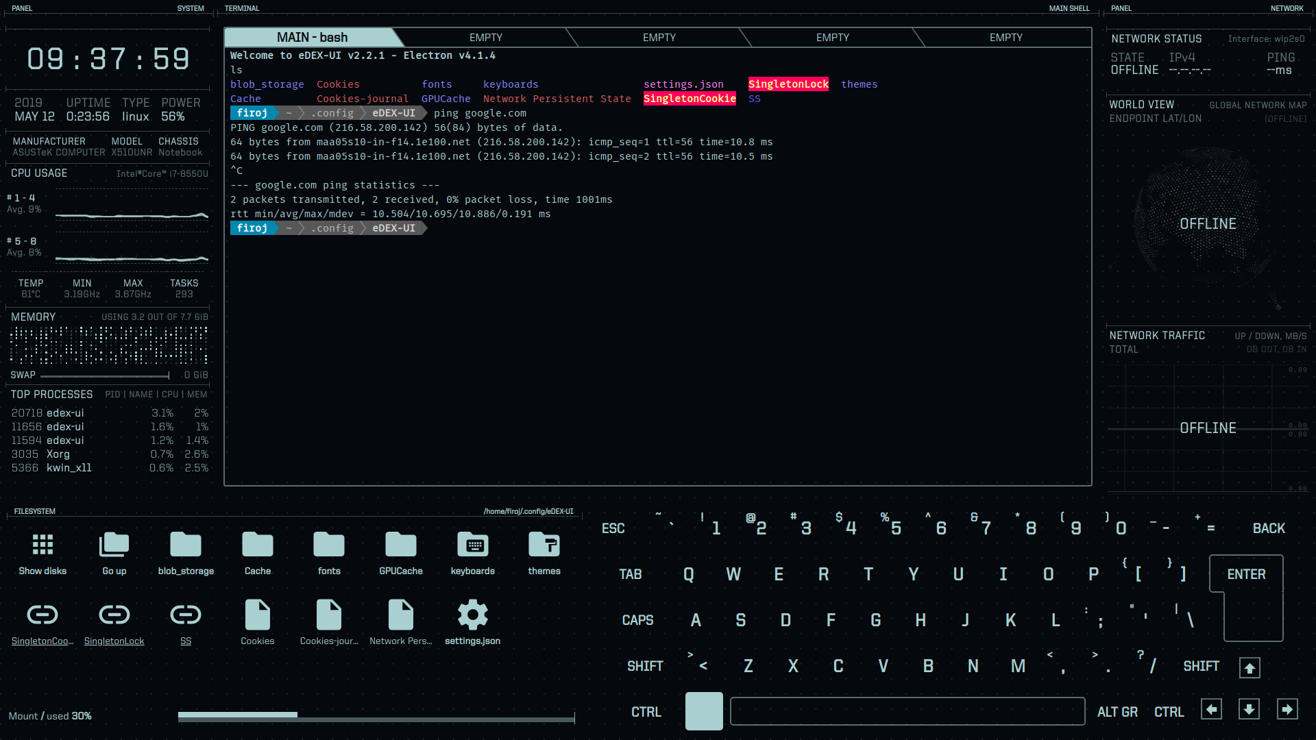 eDEX UI opens in a full-screen futuristic terminal interface. From here, you can run terminal commands, open multiple shells, and use its monitoring features.